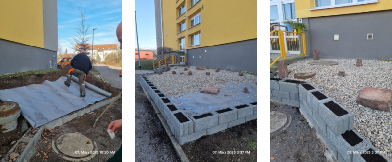 Am 07.03.2025 unterstützte uns die Firma GaLaBau Saalekreis beim Legen einer geeigneten Drainage und half bei der Erhöhung der Umrandung durch eine zweite bzw. dritte Randsteinreihe. Hier wurden auch schon die ersten drei Tonnen Steine abgekippt und verteilt. Da in den nächsten Tagen noch Nachtfrost erwartet wurde, haben wir die Bepflanzung des Beetes verschoben. Zwei Wochen später haben die Schüler/-innen der AG Greenhörner die Randsteine dann mit robusten Stiefmütterchen bepflanzt, so dass die Umgestaltung der Schutthalde nun auch Farbe annahm.