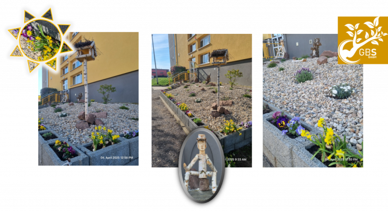 Seit dem 28.03.2025 schreitet unser Projekt dem Ende entgegen. Die Steinbeetpflanzen kamen an, wurden gepflanzt und die restlichen Steine auf dem Beet verteilt. Völlig überrascht wurden wir von der Holzfigur, die uns die Familie Brehmer geschnitzt hatte. Schnell bekam sie den Namen „Otto“. Diese und das große Vogelhäuschen sind jetzt richtige Highlights der Beetgestaltung.